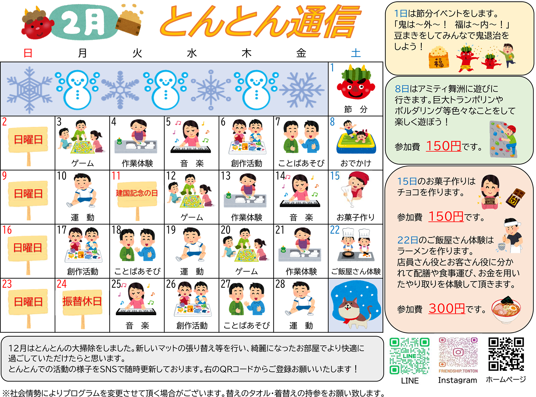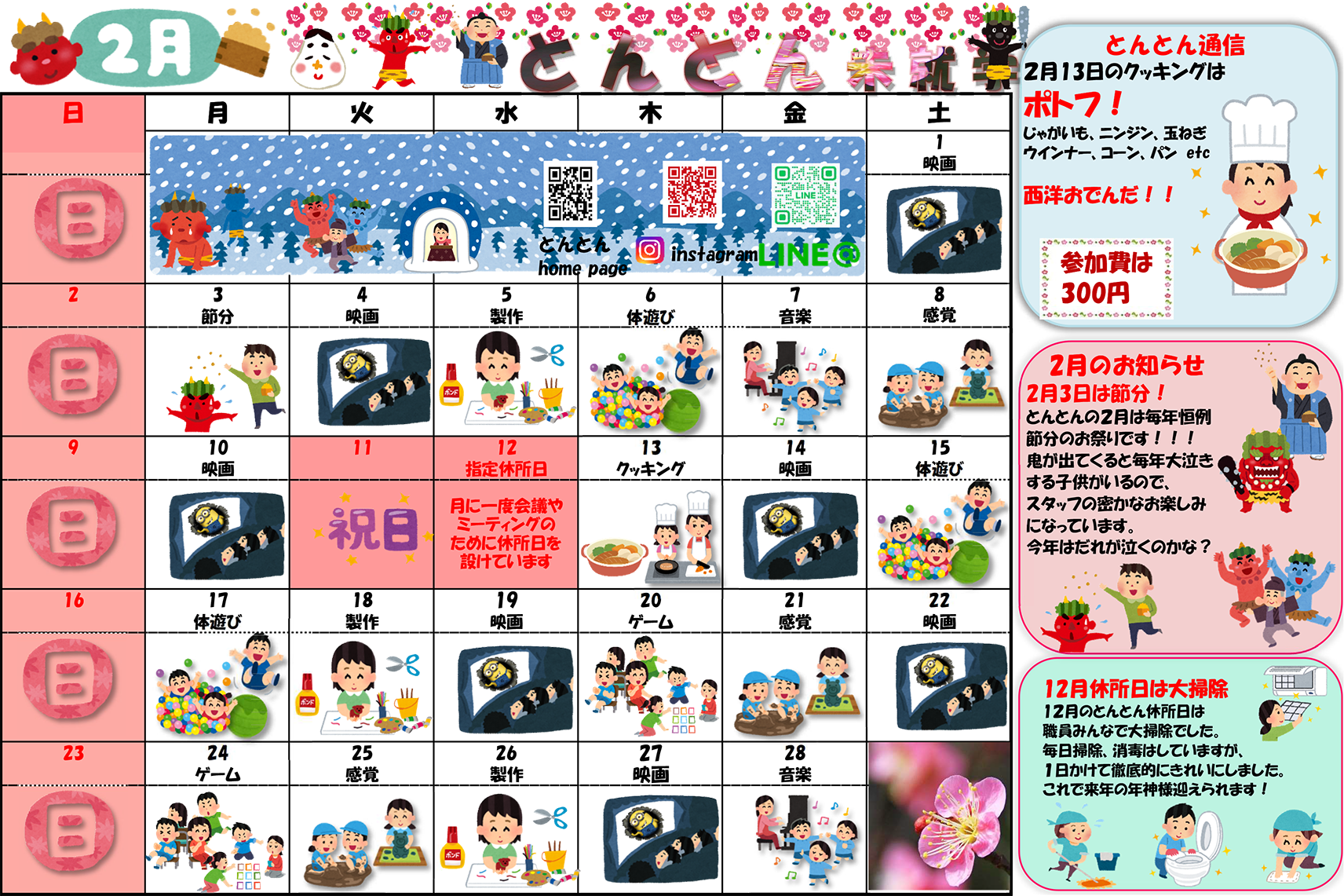 とんとんでは季節イベントやクッキングなどの企画、普段の行事の中でも楽しく成長できるようなプログラムを作成しています。