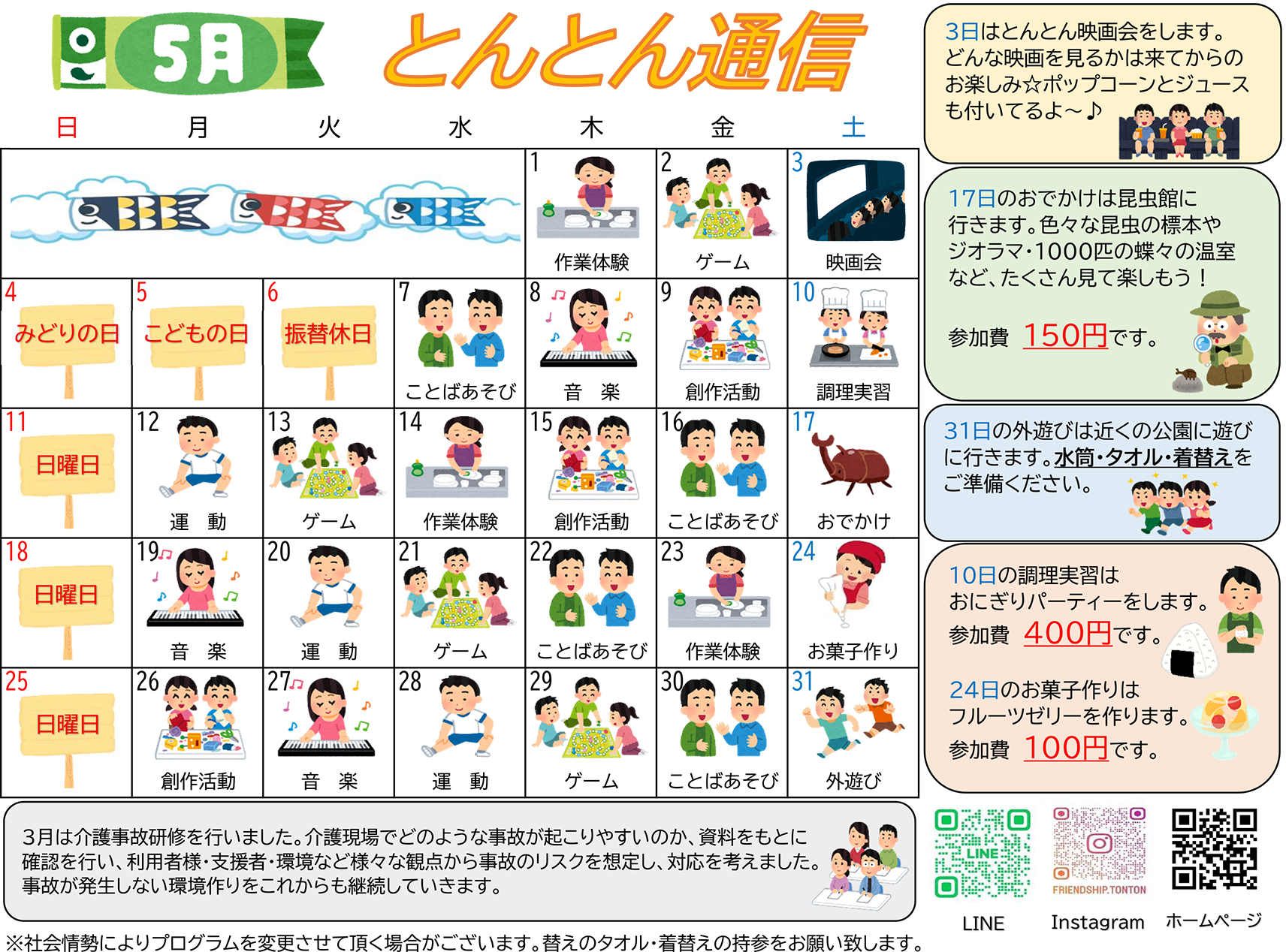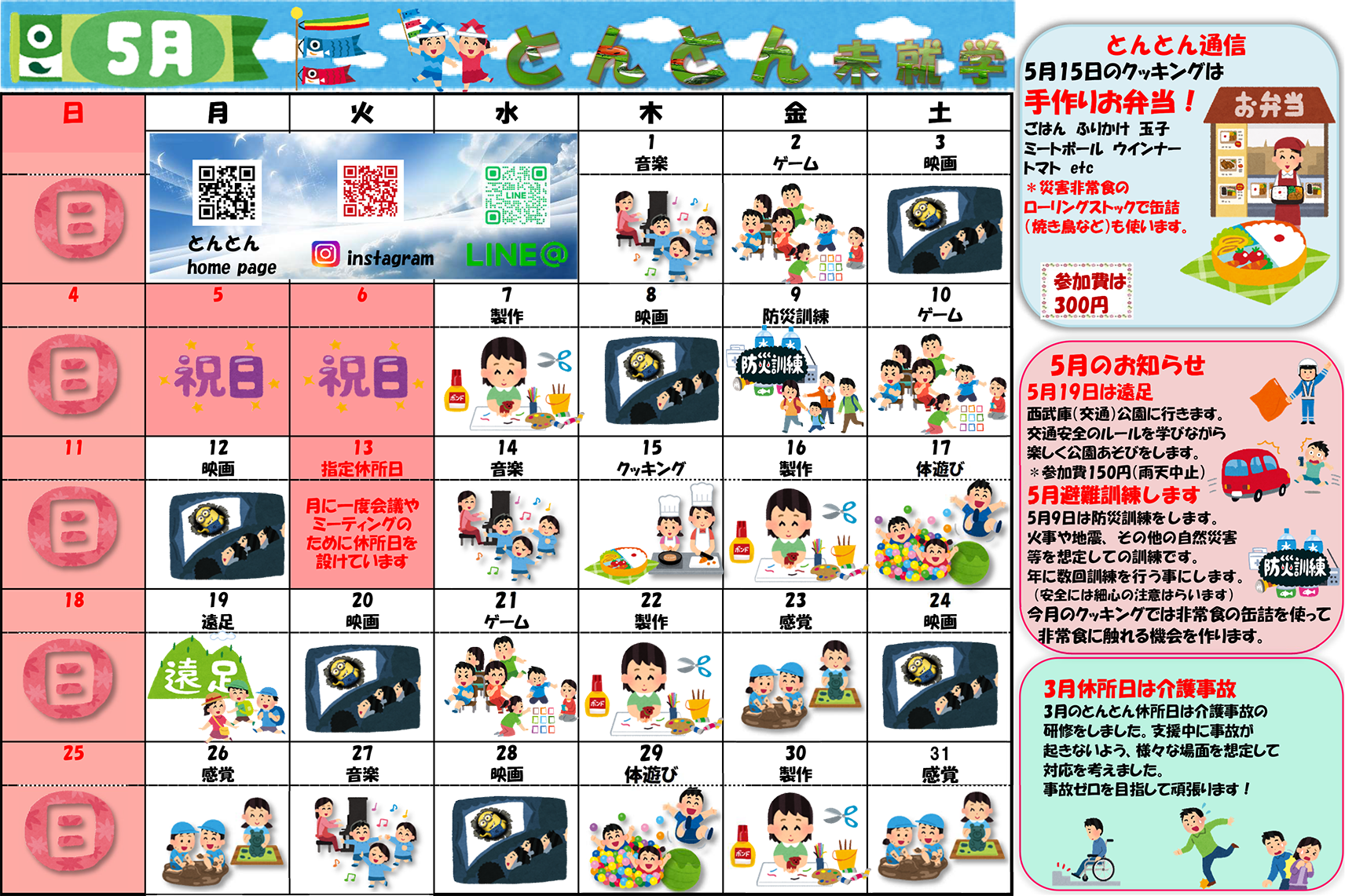とんとんでは季節イベントやクッキングなどの企画、普段の行事の中でも楽しく成長できるようなプログラムを作成しています。