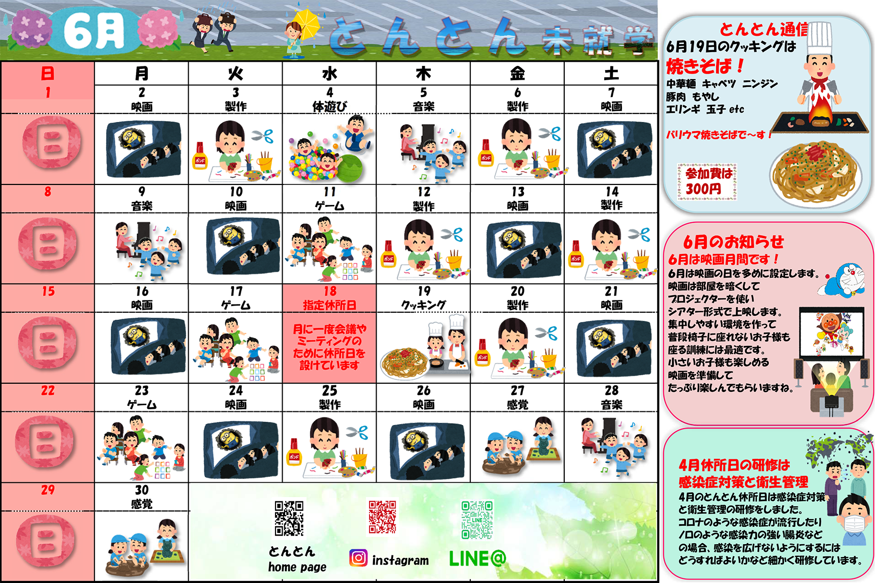 とんとんでは季節イベントやクッキングなどの企画、普段の行事の中でも楽しく成長できるようなプログラムを作成しています。